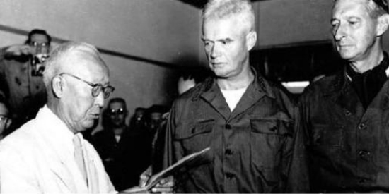 이승만 대통령(왼쪽)이 인민군에게 잡혀 3년간 포로생활을 하다 돌아온 윌리엄 딘 소장(가운데)에게 무공훈장을 수여하고 있다. 오른쪽은 미 극동군사령부 마크 클라크 대장.