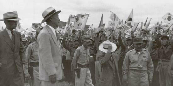 1952년 7월 포로수용소를 방문한 이승만 대통령(앞줄 왼쪽에서 둘째)이 포로들의 열렬한 환영을 받고 있다. (사진=대한민국 정부 기록사진집 제공)