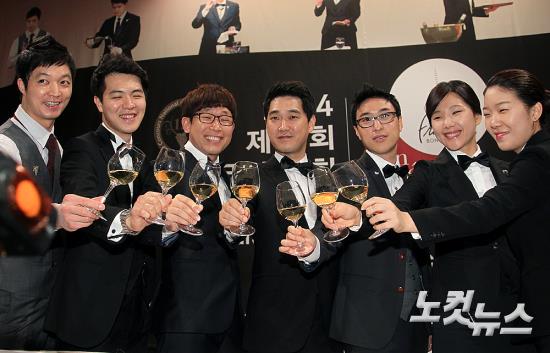 8일 오전 서울 임피리얼 팰리스호텔 두베홀에서 열린 프랑스 농업식품산림부(MAAF)가 주최하고 소펙사 코리아(SOPEXA KOREA)가 주관하는 '제13회 한국 소믈리에 대회 결선' 포토행사에서 결선 참가자들이 기념촬영을 갖고 있다.