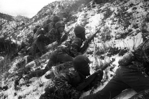 흩어져버린 무장공비를 쫓아 야산을 수색하는 국군.