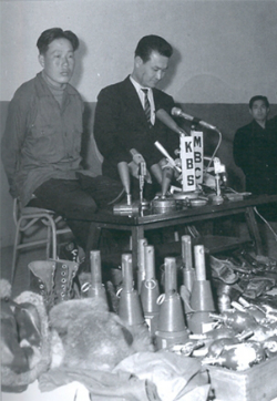 유일하게 생포된 김신조가 기자회견에서 기자들의 질문에 답하고 있다.