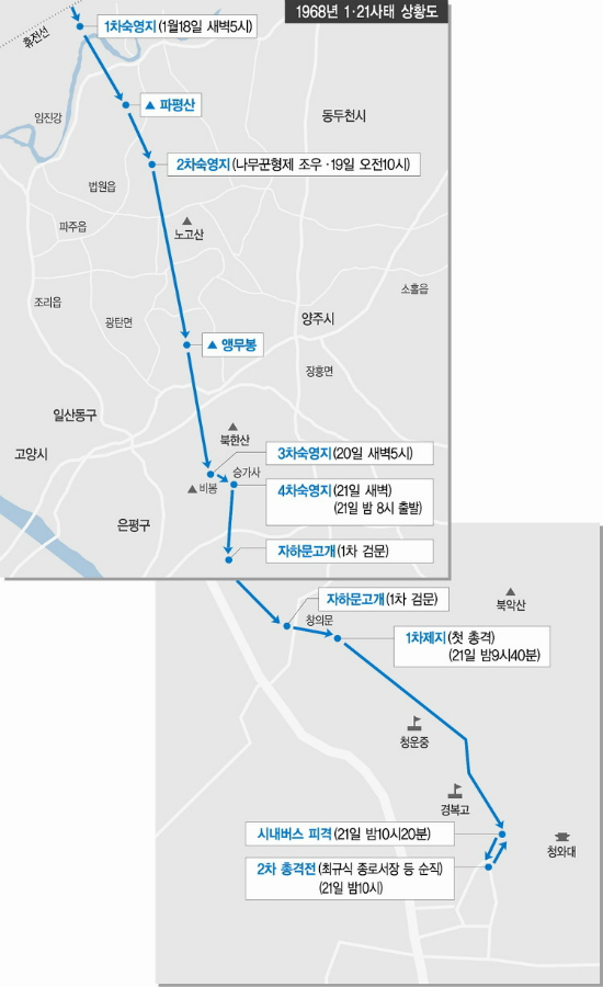 이들은 이보다 2시간 전 숨어있던 북한산 비봉 남쪽에서 내려와 청와대로 향했다.
