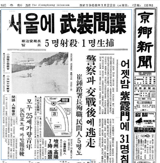 1.21사태의 발생을 보도한 경향신문 1968년 1월 22일자 신문 1면.