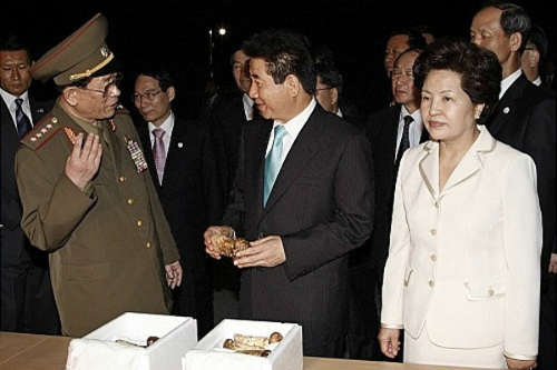노무현 전 대통령이 2007년 박재경을 통해 김정일 위원장이 보낸 송이버섯을 전달받고 있다. (사진=청와대출입사진기자단)