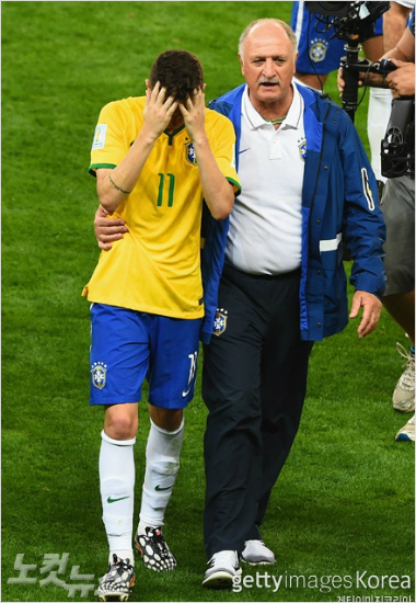 9일(한국 시각) '2014 브라질 월드컵' 독일과 4강전 참패 뒤 울고 있는 오스카(11번)를 다독이고 있는 루이스 펠리페 스콜라리 브라질 감독.(사진=게티이미지)