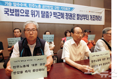 민주노총은 10일 서울 프레스센터에서 기자회견을 열고 "이번 경찰의 압수수색은 정권의 위기 탈출을 위한 색깔론 공세와 공안탄압"이라고 주장했다.