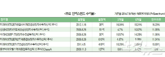■ 해외인덱스펀드에 관심 쏠려 지난 9일 에프앤가이드에 따르면 연초 이후 46개 인덱스펀드가 수익을 냈다. 큰 규모의 수익률은 아니지만 대체적으로 안정적인 모습을 띄고 있다. 그 중 '미래에셋TIGER생활소비재증권상장지수투자신탁[주식]'이 연초 이후 16.29% 수익률을 기록하며 인덱스주식섹터로는 1위를 차지했다. 2012년 1월에 출시된 이 상품은 2년간 최고 26% 수익률까지 오르기도 했다.