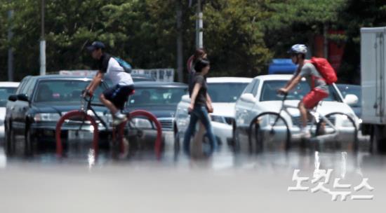 전국 곳곳에 폭염 주의보가 발령된 11일 서울 영등포구 여의대로에 아지랑이가 피어오르고 있다.