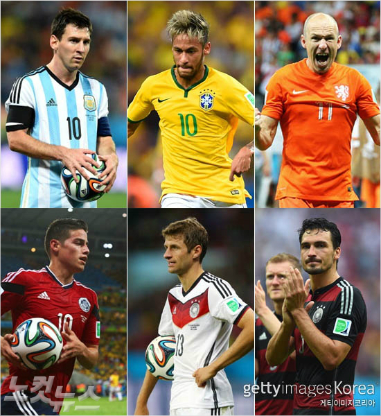 왼쪽 위부터 시계방향으로 리오넬 메시, 네이마르, 아르옌 로번, 마츠 후멜스, 토마스 뮐러, 하메스 로드리게스. (사진=ⓒGettyImages/멀티비츠 제공)