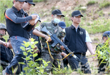 강원도 동부전선 GOP서 총기난사 후 도주해 구속된 임 병장이 지난 8일 오후 현장검증을 받고 있다. (황진환 기자/자료사진)