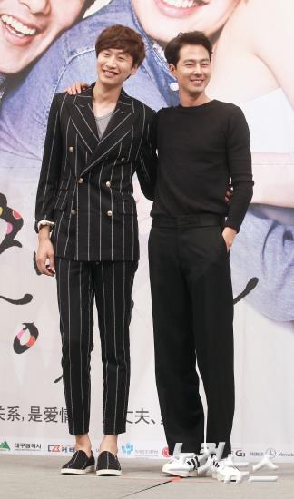배우 이광수와 조인성이 15일 오후 서울 논현동 임피리얼 팰리스 호텔에서 열린 SBS드라마스페셜 ‘괜찮아 사랑이야’ 제작발표회에 참석해 포토타임을 갖고 있다.