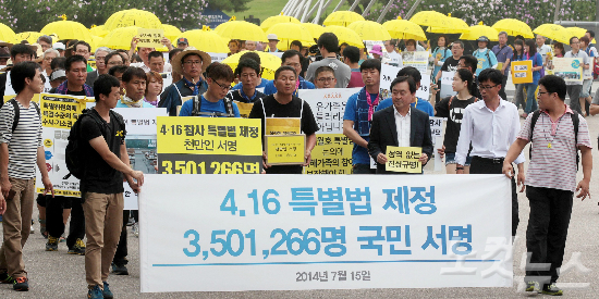 세월호 사고 일반인 희생자 유가족 대책위원회와 세월호 참사 희생자, 실종자, 생존자 가족대책위원회 대표단 및 세월호 참사 국민대책회의 등이 15일 오전 서울 여의도 문화마당에서 세월호 특별법 제정 위한 350만 국민서명 국회의장 전달 기자회견을 마친 뒤 국회의사당을 향해 행진하고 있다. (사진=박종민 기자)