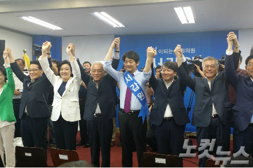 새정치민주연합 서갑원 후보가 안철수, 김한길 대표와 함께 등장하자 서 후보 선거사무실을 찾은 수백 명의 지지자들이 일제히 환호했다.
