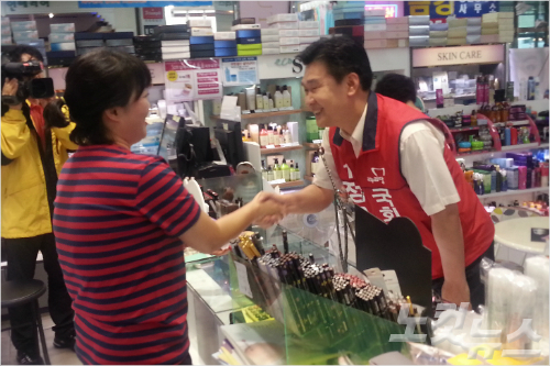 대전 대덕구 국회의원 보궐선거에 출마한 새누리당 정용기 후보가 17일 법동 보람코아 상가를 돌며 주민들과 인사를 나누고 있다.