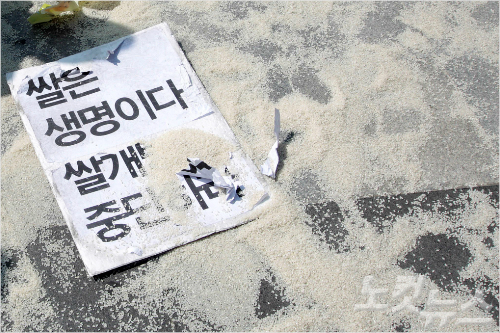정부의 '쌀 시장 전면 개방' 발표에 농민단체 대표들은 삭발 투쟁에 나서며 "박근혜 정권이 식량 주권을 팔아먹었다"고 강력히 반발했다.