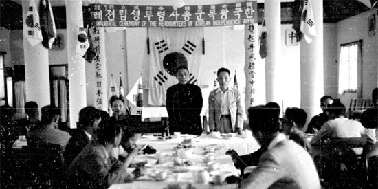김구 주석이 1940년 9월 17일 중경에서 열린 한국광복군 창설기념식 직후 열린 오찬장에서 축사를 하고 있다.