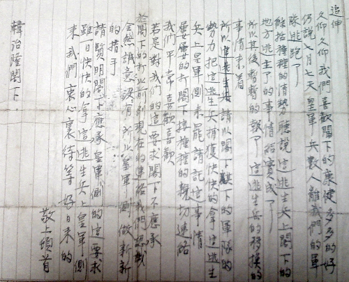 대장인 듯한 사내가 이 글을 보더니 "우리는 중국 중앙군 소속의 유격대이고, 우리의 영수는 장개석 총통이다"라고 썼다.