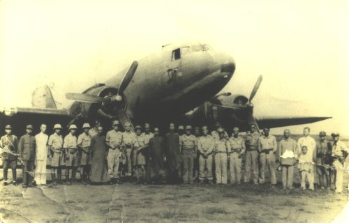 1945년 8월 19일 산동성 유현 비행장에 불시착하여 중국군과 함께 포즈를 취했다. 왼쪽에서부터 네 번째가 장준하, 그 오른쪽으로 노능서, 김준엽.