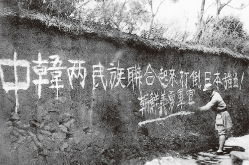 일본군 점령 지역에 침투해 폐허가 된 사찰의 담장에 항일 표어를 쓰는 조선의용군 화북 지대 선전대원.