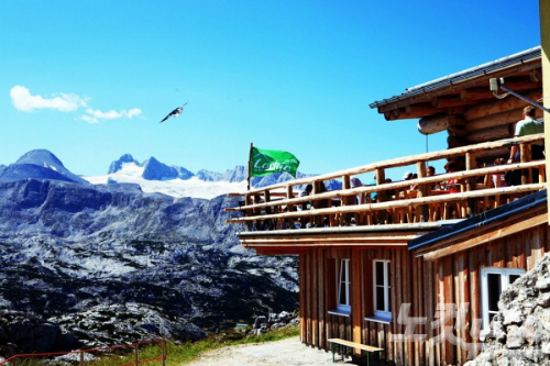 맥주와 간단한 안주거리, 혹은 음료수를 시켜 들고 전망이 좋은 테라스에서 다흐슈타인의 빙하를 바라보며 힐링을 만끽할 수 있다.