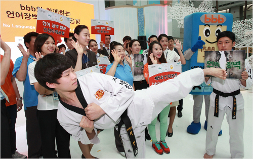 비비비코리아는 23일 인천국제공항 1층 입국장 밀레니엄 홀에서 인천공항을 방문하는 내외국인들 대상으로 bbb 통역 애플리케이션을 직접 체험할 수 있는 디지털 모바일 부스, 대형 터치 스크린 게임을 통한 bbb 소개 이벤트는 물론, 태권도 시범단을 초청해 언어문화 장벽 격파 공연 등을 선보였다(사진).