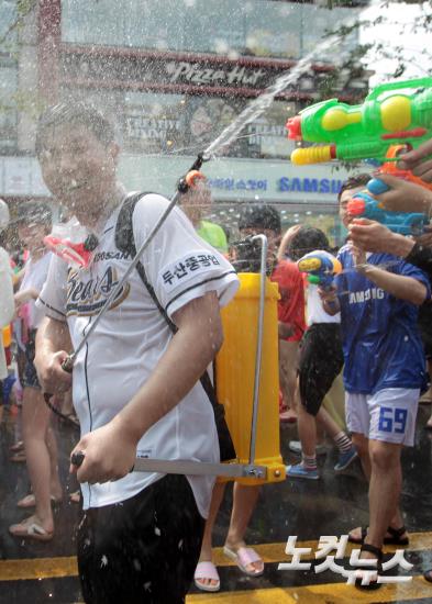27일 서울 서대문구 창천동 신촌 연세로에서 열린 '제2회 신촌 물총 축제'를 찾은 시민들이 물총을 쏘며 무더위를 날리고 있다.
