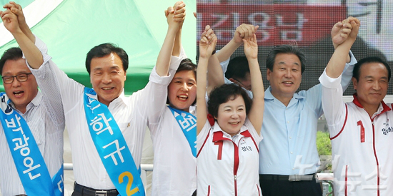 새누리 텃밭이던 수원병은 새정치 손학규 후보와 새누리 김용남 후보가 반대로 새정치 텃밭인 수원정은 새누리 임태희, 새정치 박광온 후보가 역시 혼전입니다.
