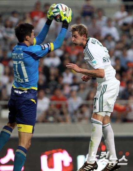 30일 오후 서울 마포 월드컵경기장에서 열린 독일 바이엘 04 레버쿠젠(이하 레버쿠젠)과 FC서울의 경기에서 레버쿠젠 슈테판 키슬링이 헤딩슛을 시도하고 있다.