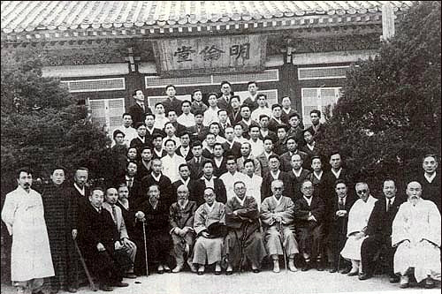 김창숙 선생이 주도해서 세운 성균관대의 명륜당 앞에 선 백범 김구 (앞줄 앉아있는 7명 중 왼쪽에서 네번째)와 김창숙 선생(백범의 오른쪽). 이들 유림 대부분이 일본 경찰에 체포되었다.