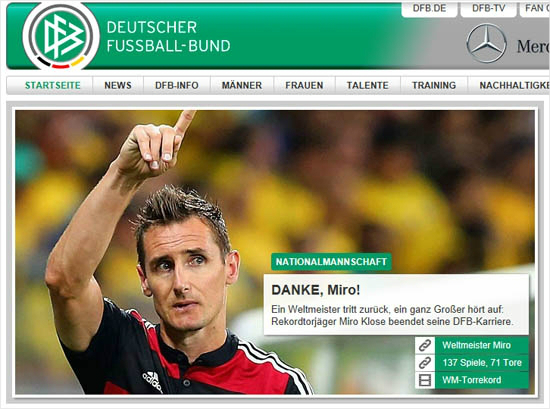 클로제는 "브라질 월드컵을 통해 어릴 적 꿈은 실현됐다"며 "독일 축구의 영광에 일조했다는 데 자랑스럽고 행복하다"며 은퇴 소감을 밝혔다.