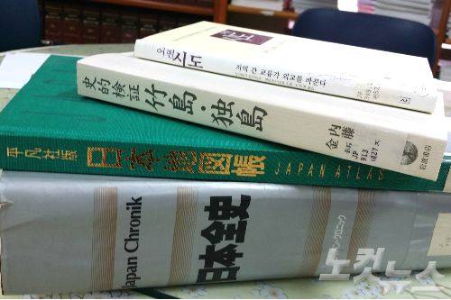 강원춘천시립도서관에 비치되어 있는 일본 왜곡서적 중 일부.