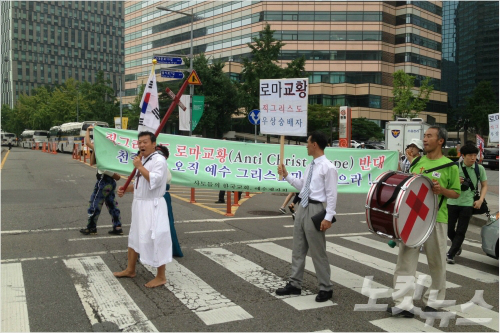 그러나 같은 시각 청계천 한빛공원에서는 개신교인 200여명이 모인 가운데 가톨릭과 교황 제도를 반대하는 집회가 개최됐다.