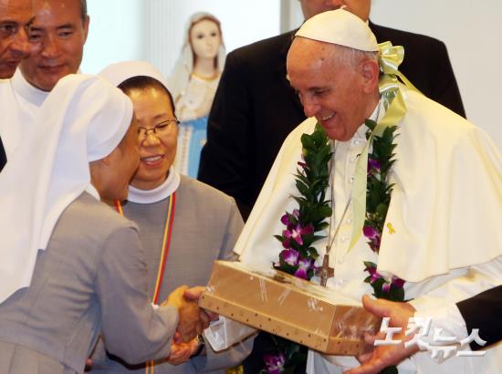 프란치스코 교황이 16일 충북 음성 꽃동네 희망의 집에서 수녀들이 준비한 선물을 받고 있다.