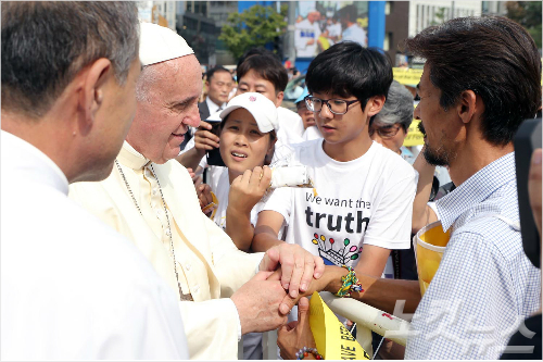 차에서 내린 교황이 발길을 멈춘 곳에는 김영오 씨가 서 있었다. 그는 세월호 참사의 진상 규명을 요구하며 광화문에서 34일째 단식 중인 단원고 학생 고 김유민 양의 아버지이다.