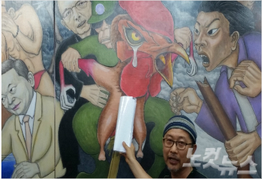 홍성담 화백이 8일 박 대통령을 허수아비로 묘사한 작품에서 박 대통령을 닭 모양으로 바꾸는 수정작업에 대해 설명하고 있다. (사진 = 광주CBS 조기선 기자)