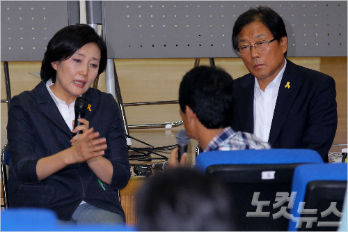 새정치민주연합 박영선 원내대표가 20일 오후 경기도 안산시 단원구 세월호 희생자 정부 공식 합동분향소 회의실에서 세월호 희생자 유가족대책위 임원들과 특별법 여야 협상 과정에 대해 이야기를 나누고 있다. 박종민기자