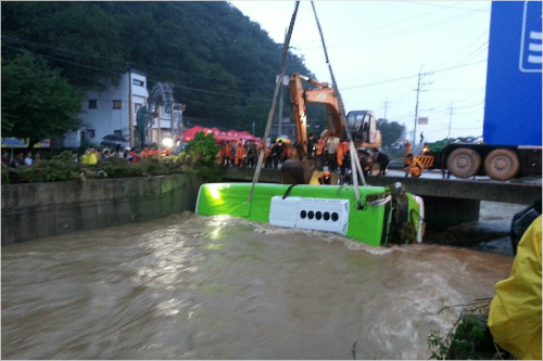 경남 창원시 마산합포구 진동면 지산교 인근 덕곡천에서 시내버스가 불어난 물에 휩쓸려 떠내려간 것은 25일 오후 2시 50분쯤.