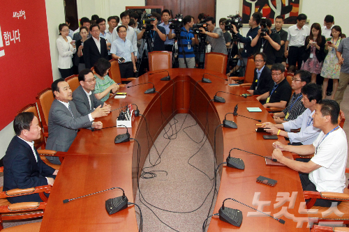 새누리당 이완구 원내대표, 김재원 원내수석부대표, 주호영 정책위의장이 25일 오후 국회 새누리당 원내대표실에서 세월호 특별법 제정과 관련 유가족들과 면담을 갖고 있다. (사진=윤창원 기자)
