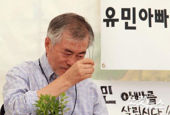 제대로 된 세월호 특별법 제정을 촉구하며 단식농성 8일째를 맞고 있는 새정치민주연합 문재인 의원이 26일 오전 서울 광화문광장 농성장에서 독서 전 안경을 고쳐쓰고 있다.