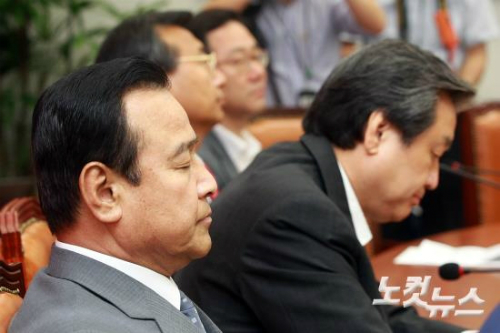 눈감은 이완구 새누리당 원내대표와 김무성 새누리당 대표 (사진=윤창원 기자)