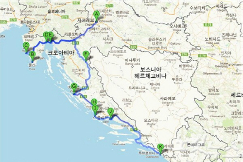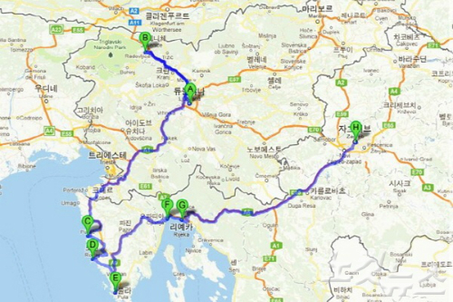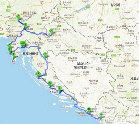A.자그레브 - B.류블랴나(140km ,1시간37분)- C.블레드(58km,43분)- D.포레츠(213km,2시간26분)- E.로비니(36km,42분)- F.풀라(36km,40분)- G.오파티야(96km,1시간30분)- H.리예카(13km,21분)- I.플리트비체(174km,2시간18분)-J.자다르(133km,1시간56분)-K.시베니크(86km,1시간6분)-L.스플리트(82km,1시간4분)-M.두브로브니크(253km,4시간9분)- N.코토르(87km,1시간33분)-O.부드바(20km.20분)