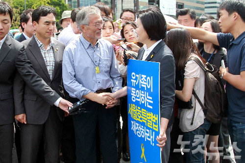 새정치민주연합 박영선 국민공감혁신위원장 겸 원내대표가 27일 서울 광화문 광장에서 유가족이 동의하는 세월호 특별법 제정을 촉구하는 피켓 시위 가진 가운데 단식 농석중이 문재인 의원과 만나 악수를 하고 있다. (사진=윤창원 기자)