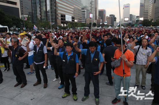 전국민주노동조합총연맹 조합원들이 28일 오후 서울 광화문광장에서 파업 결의대회를 갖고 세월호 특별법 제정을 촉구하고 민영화 저지, 공공기관 가짜 정상화 분쇄 등을 요구하고 있다.