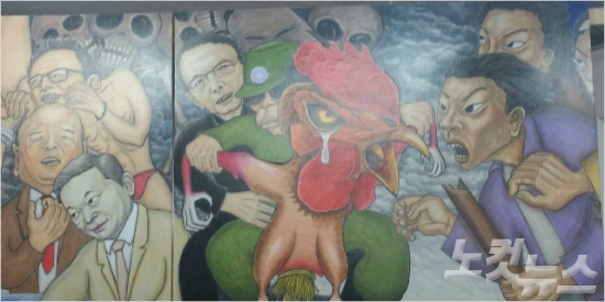 홍성담 화백의 '세월오월'에서 박근혜 대통령이 박정희 전 대통령의 허수아비로 묘사돼 있다. (사진=조기선 기자)