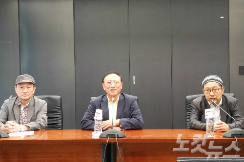박 대통령을 허수아비로 풍자한 작품인 '세월오월' 전시 유보와 관련해 광주비엔날레 이용우 대표이사와 정범모 책임 큐레이터, 홍성담 화백이 공동 기자회견을 갖고 있다. (사진=조기선 기자)