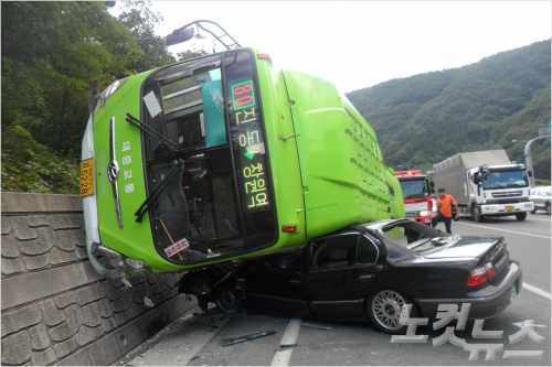 시내버스는 방호벽과 가드레일을 들이받고 옆으로 넘어지면서 승용차 위로 올라갔다.