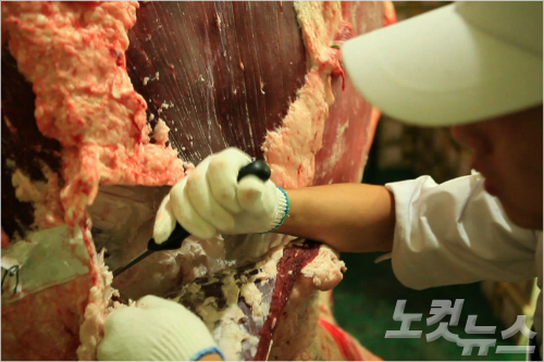 무한정의 김영호 부장이 직접 한우를 발골하고 있다.
