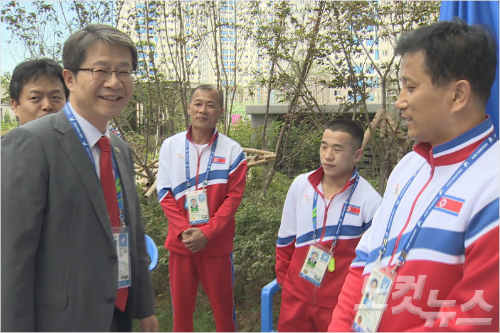 류길재 통일부장관은 18일 인천 아시안게임 선수촌을 방문해 장수명 북한 올림위원회 대표와 선수들을 만났으나, 면담 등은 이뤄지지 않았다.