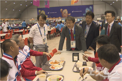 류길재 통일부장관은 선수촌 식당에서 식사 중인 남자축구 윤정수 감독과 선수단을 만나 인사를 나눴다. (사진 = 통일부 제공)