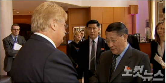 엘마 보코 유럽의회 외교위원장이 벨기에를 방문한 강석주 비서를 만나는 모숩(사진=VOA)